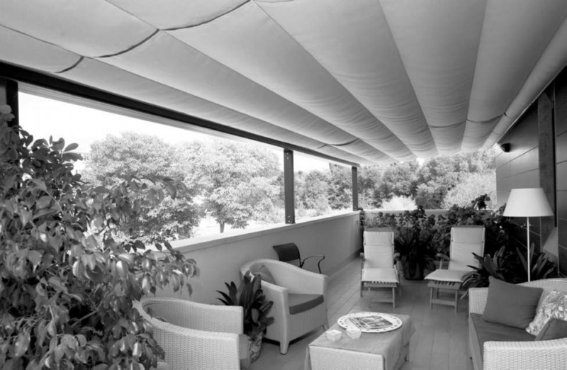 The air chamber formed between the outer and inner canvas improves thermal insulation, prevents condensation and hides the technical elements of the structure. The canvas is applied to the sticks with clips in stainless steel and aluminum tubing inside the fabric; this system