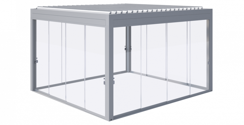 Sliding glass panes with tempered monolithic glass panels without perimeter frames that create a completely glass effect. Each of the panels slides by means of stainless steel trolleys that allow a fluid movement and which are fixed directly to the glass that move on parallel tracks that are integrated in the lower track. Transparent sealing gaskets ensure protection of wind and rain between one panel and the other.