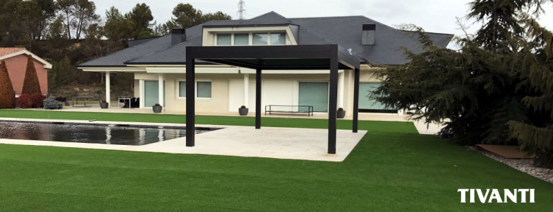 Bioclimatic pergola of lamas Med Twist Island in anthracite color 416 Gibus sablé located next to the pool to improve the comfort of pool users so they can enjoy the sun or shade at any time at their convenience by simply adjusting the inclination of the lamas.