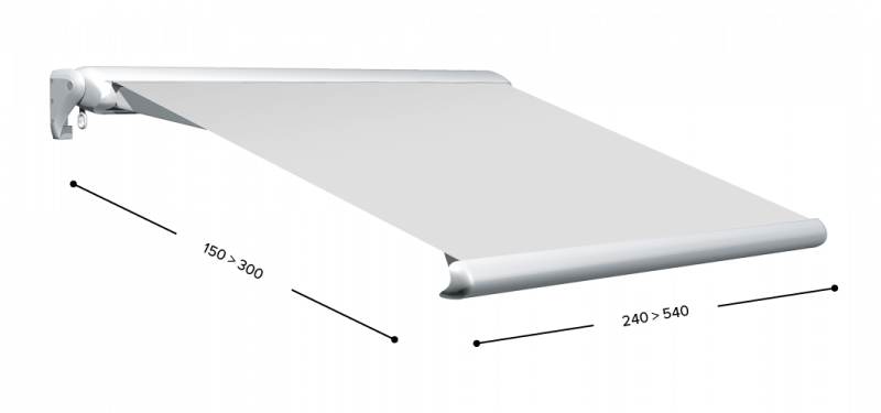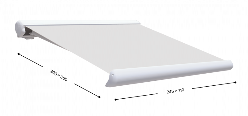 Toldo de brazos extensibles de cofre de sección ovalada. Puede instalarse en el techo o en la pared. Hay disponibles dos versiones: Scrigno 250, con voladizo máximo de 300 cm y anchura de 540 cm, o Scrigno 300, con voladizo máximo de 350 cm y anchura de 710 cm. Con el toldo cerrado la lona y los brazos se recogen en el cofre que garantiza la mejor protección y un aspecto estético de alto nivel.