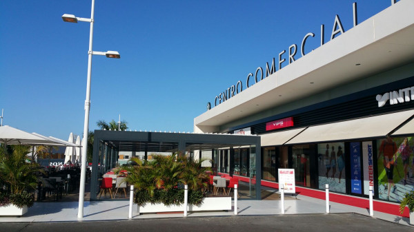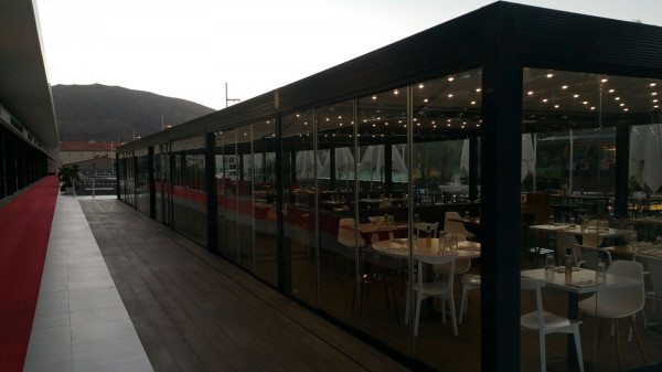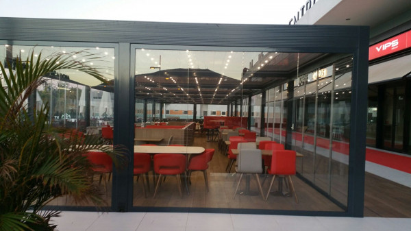 Cerramiento de terraza compartido para 3 restaurantes del centro comercial Parque Santiago Sur 6 en Tenerife, de las cadenas VIPS, Ginos y Starbucks, que cubre una superfície de 28 mts de largo x 7 mts de ancho.